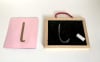 - Lower-case letters cut out in the finest sandpaper and mounted on card (vowels on blue cards, consonants on pink)