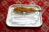 Transfer the corn kernels from one bowl to the other by moving the coffee scoop across the tray.Repeat this action until all the grains have been transferred, then replace the coffee scoop on the tray. Pick up any kernels you may have spilled only at the end of your presentation and place them into the full bowl. Reverse the bowls so that the activity is ready for the child to use.